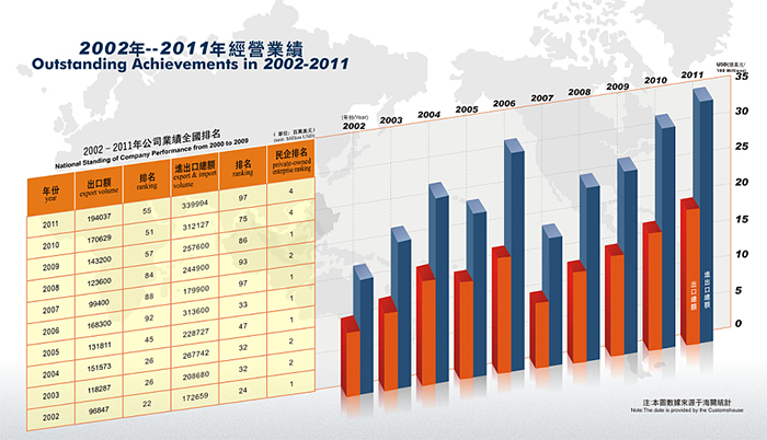 近年來,公司發(fā)展勢(shì)頭良好, 2014年公司實(shí)際出口額達(dá)到10.5億美金,排名“2014中國出口200強(qiáng)”第192名,其中民營企業(yè)排名第21名。公司先后獲得 “中國守合同重信用企業(yè)”、 “廣東省先進(jìn)集體”、“廣東省優(yōu)秀民營企業(yè)”、“東莞市50強(qiáng)民營企業(yè)”,“東莞市文明單位”等稱號(hào),公司被東莞市政府授予“東莞市50強(qiáng)民營服務(wù)業(yè)企業(yè)”光榮稱號(hào),公司董事長陳海生被授予“東莞市優(yōu)秀民營企業(yè)家”光榮稱號(hào)。